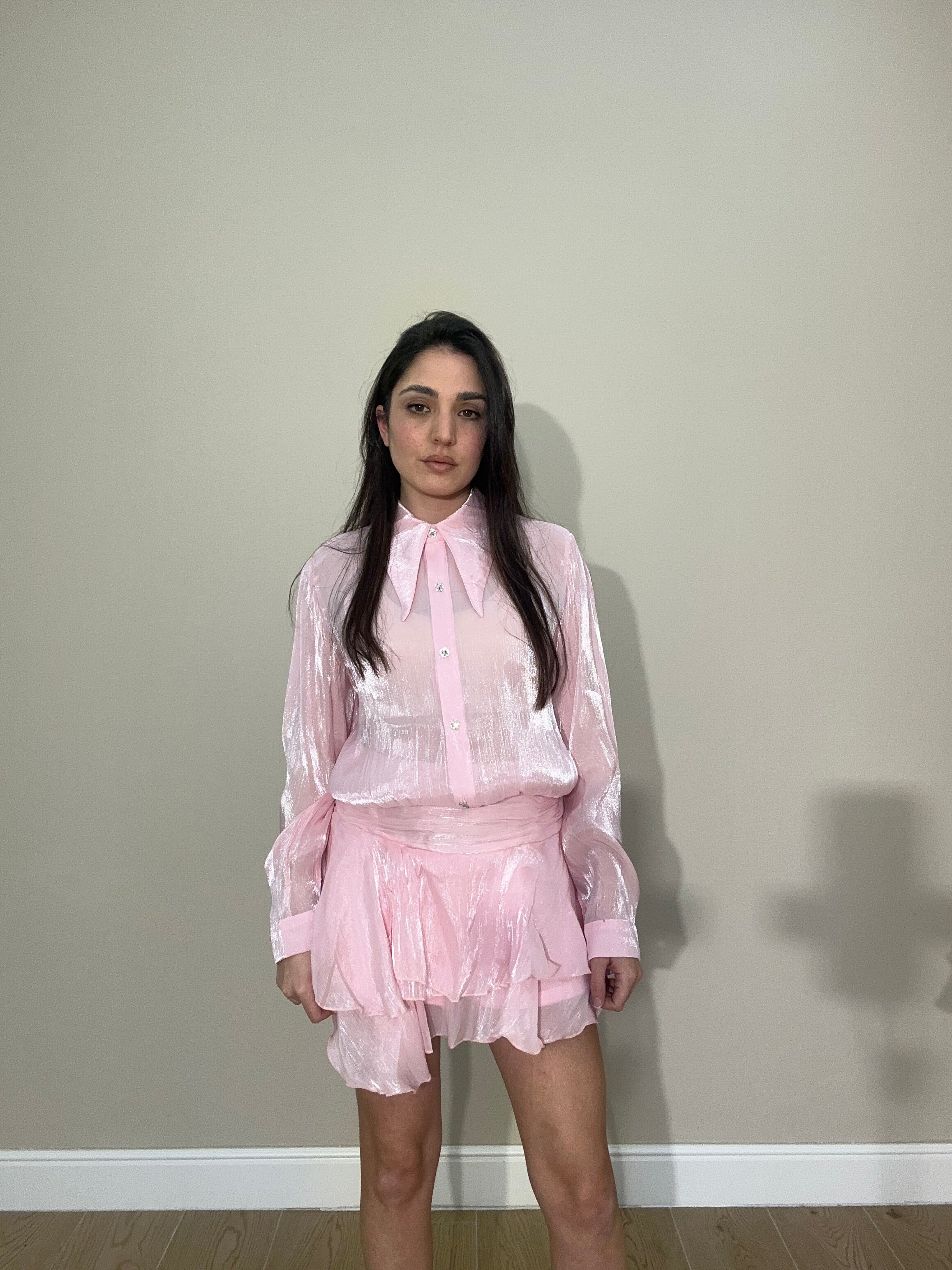 Vestito in chiffon satinato composto da  maxi colletto e balze con vita arricciata. Un look leggero e chic.