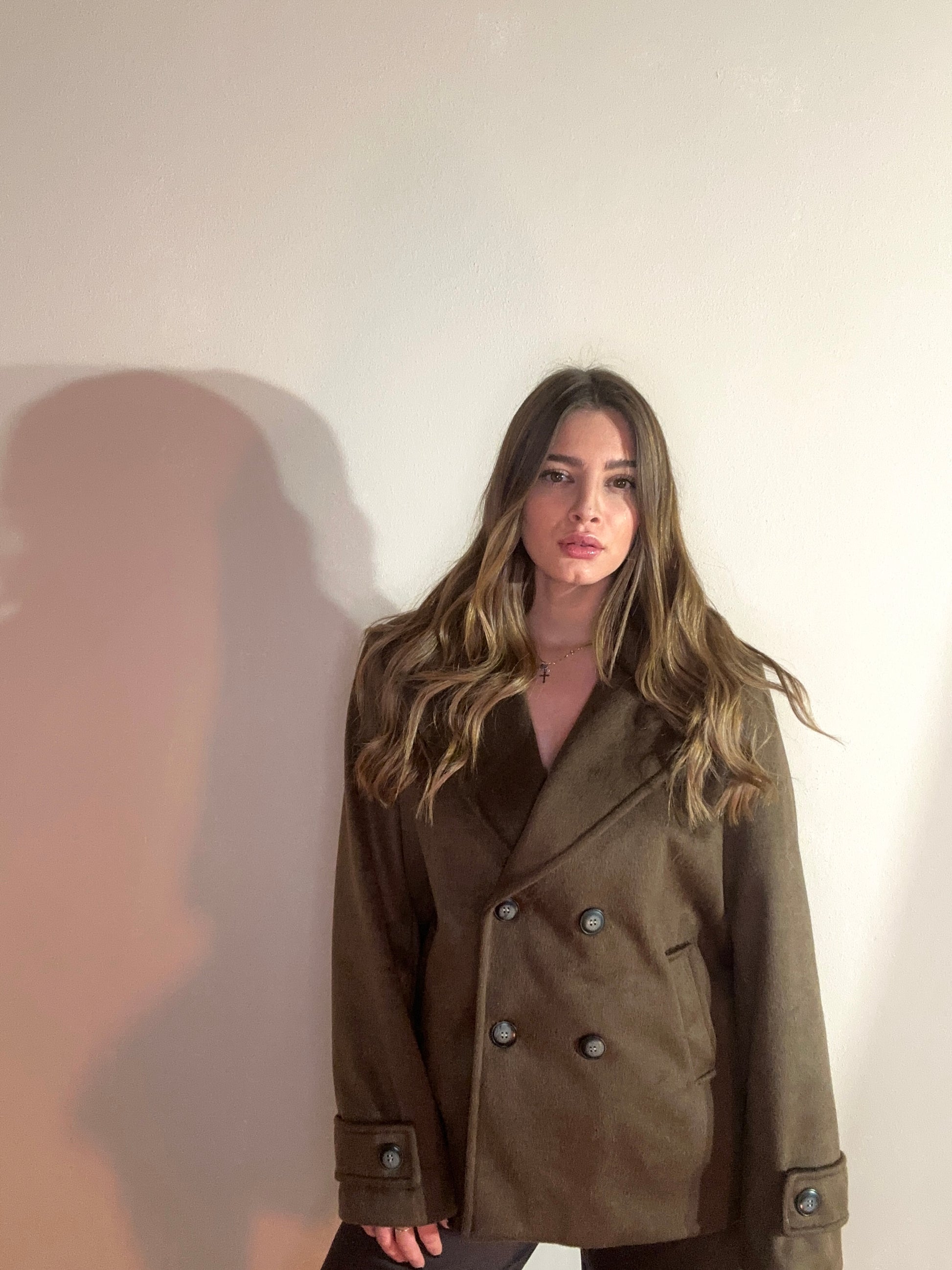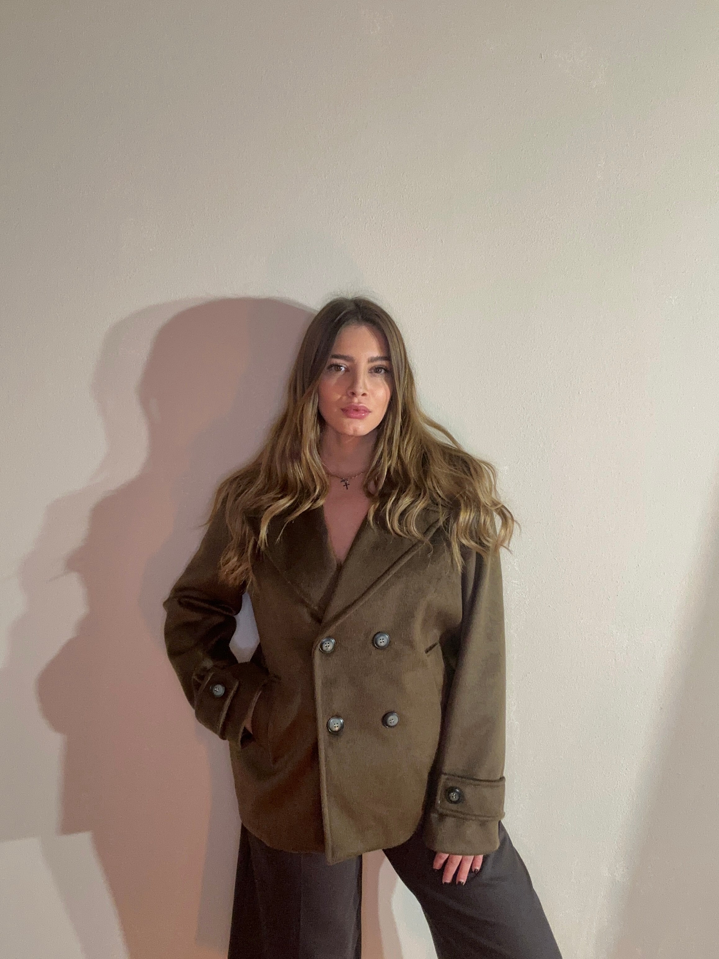 Cappotto doppiopetto in camoscio morbido, dal taglio leggermente oversize