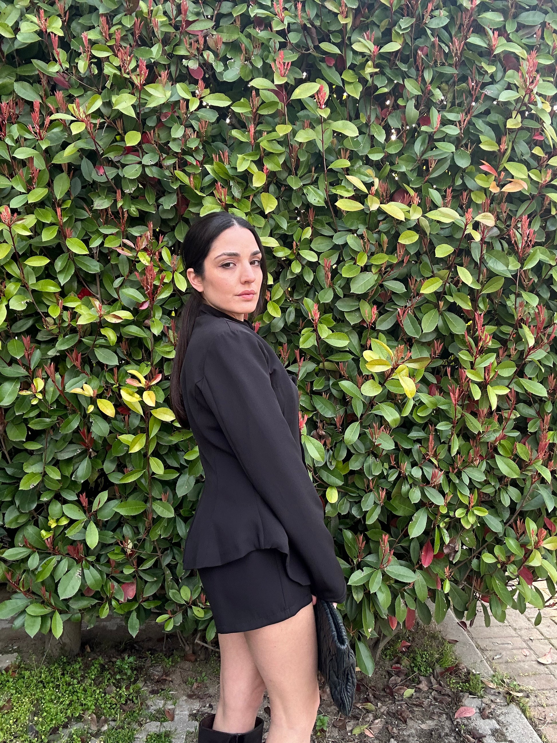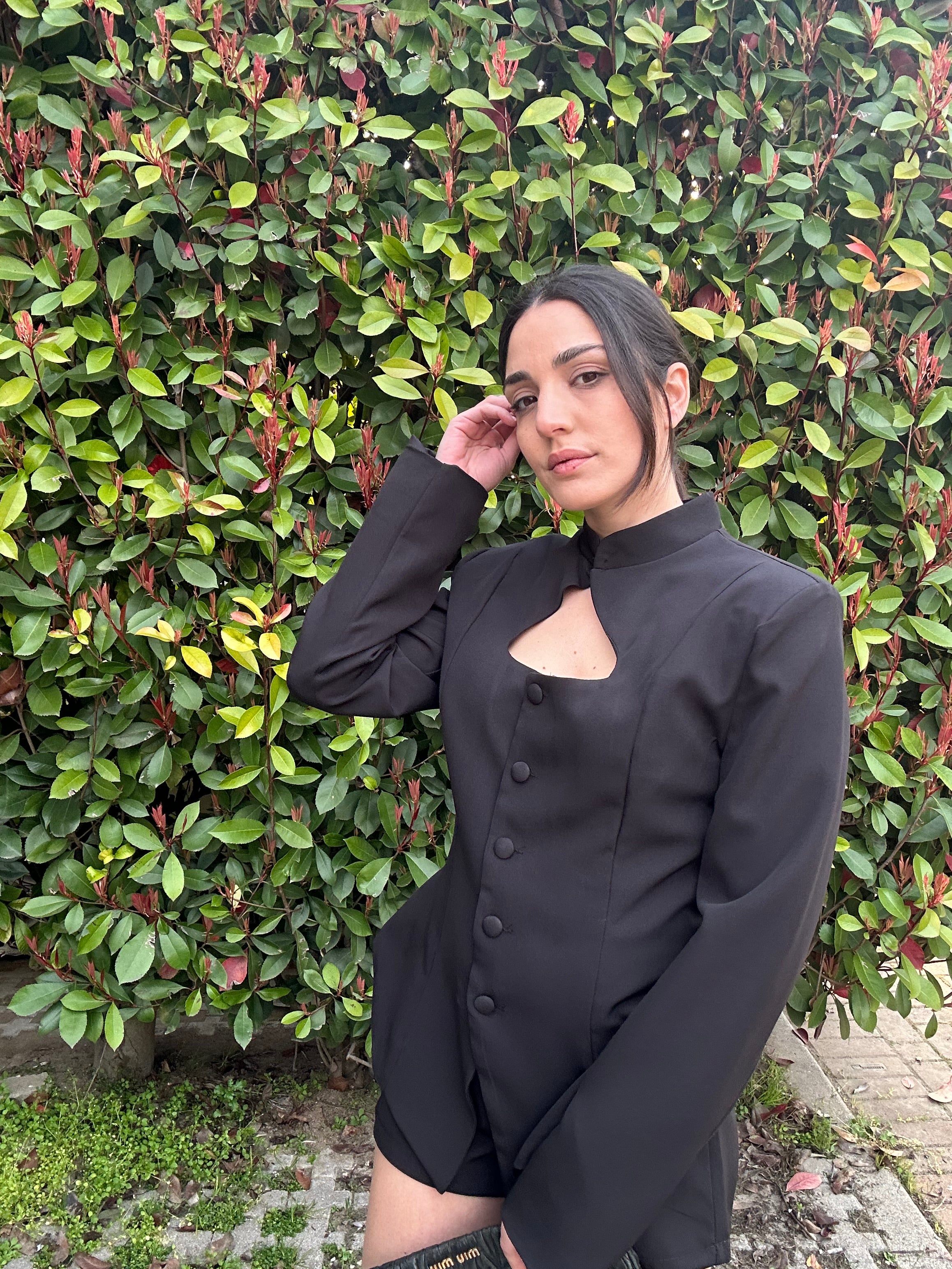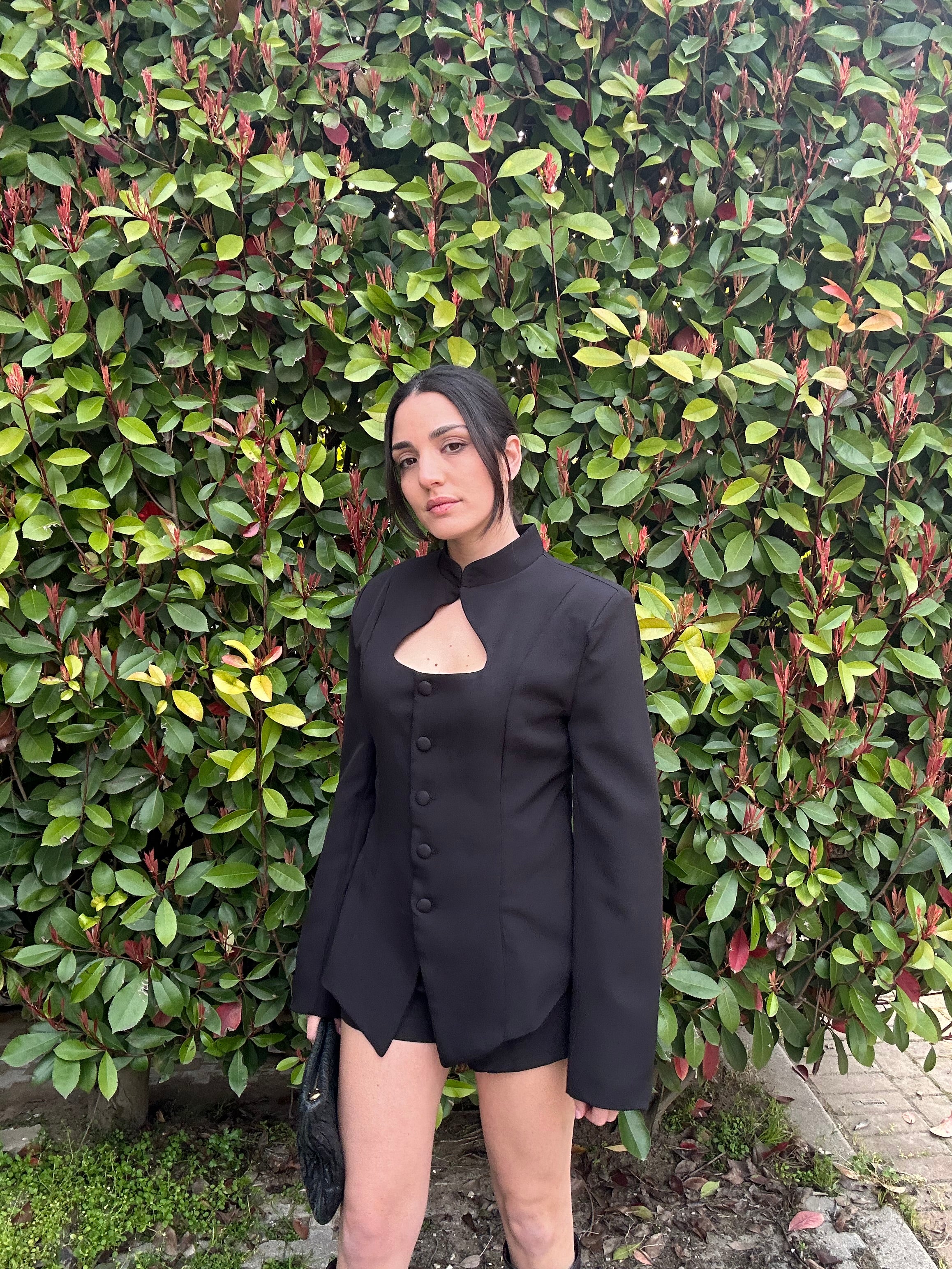 Taglio sartoriale con colletto alla coreana e una particolare apertura a goccia sul petto. La chiusura è frontale con bottoni rivestiti in tinta.Pantaloncini Coordinati, dal taglio essenziale e aderente, che bilanciano la linea strutturata della giacca.