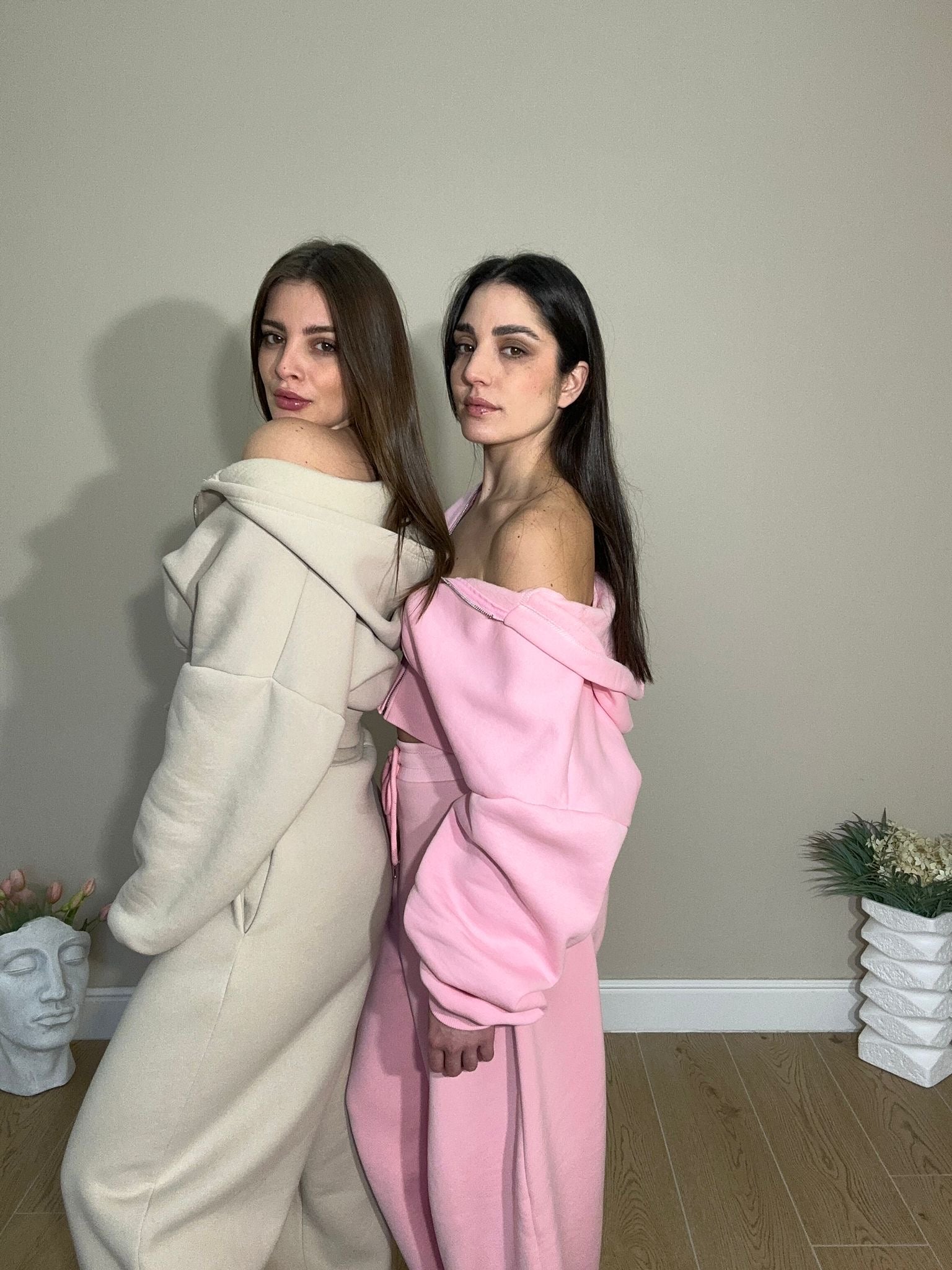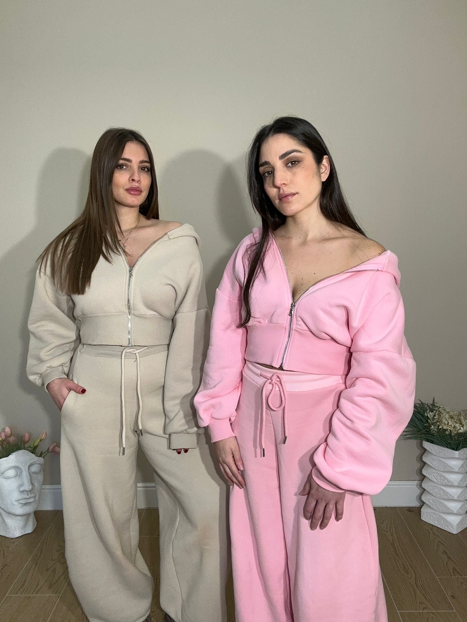 Set coordinato in tessuto morbido, con felpa a zip dal taglio sagomato e pantaloni a gamba larga.