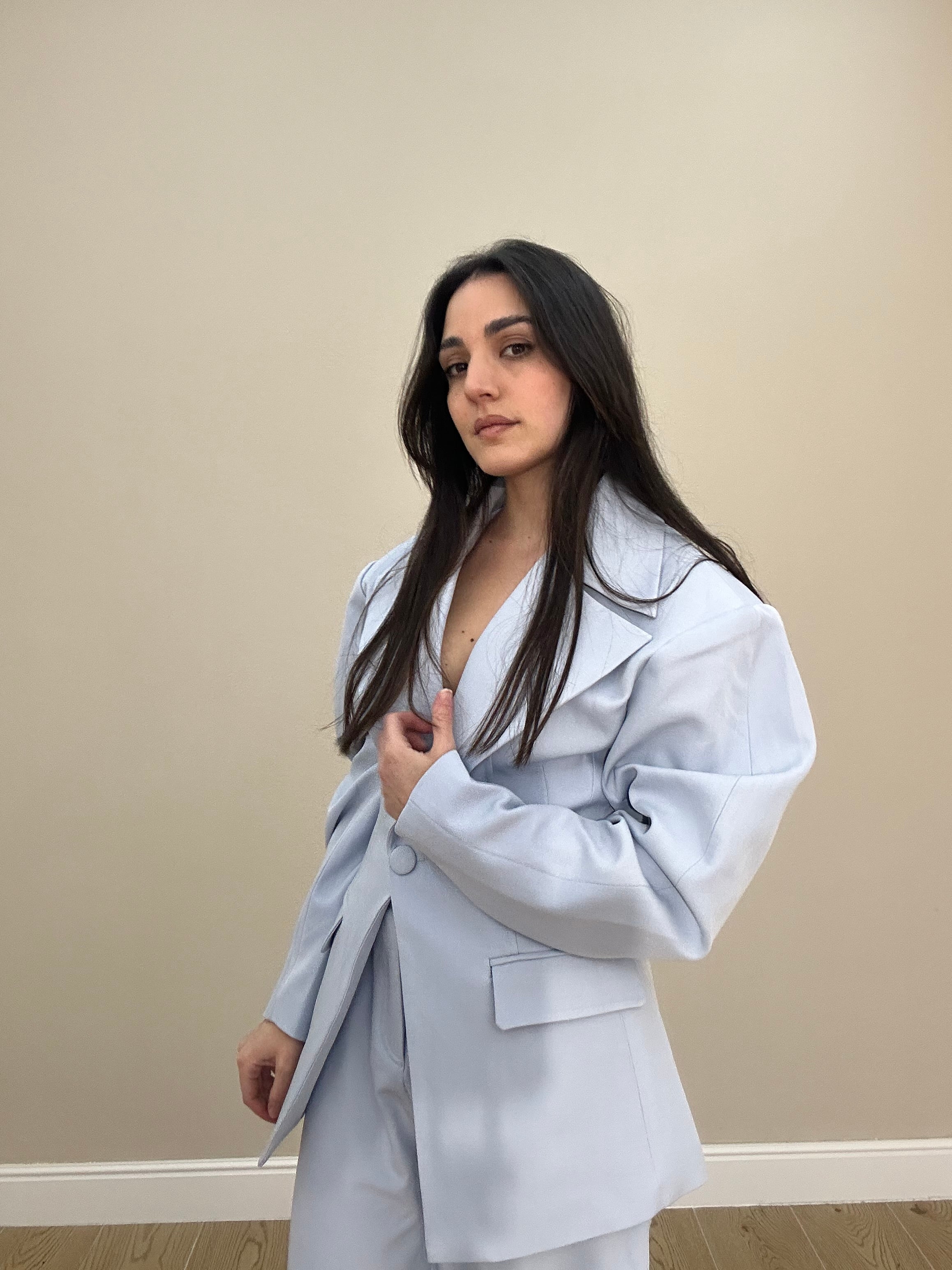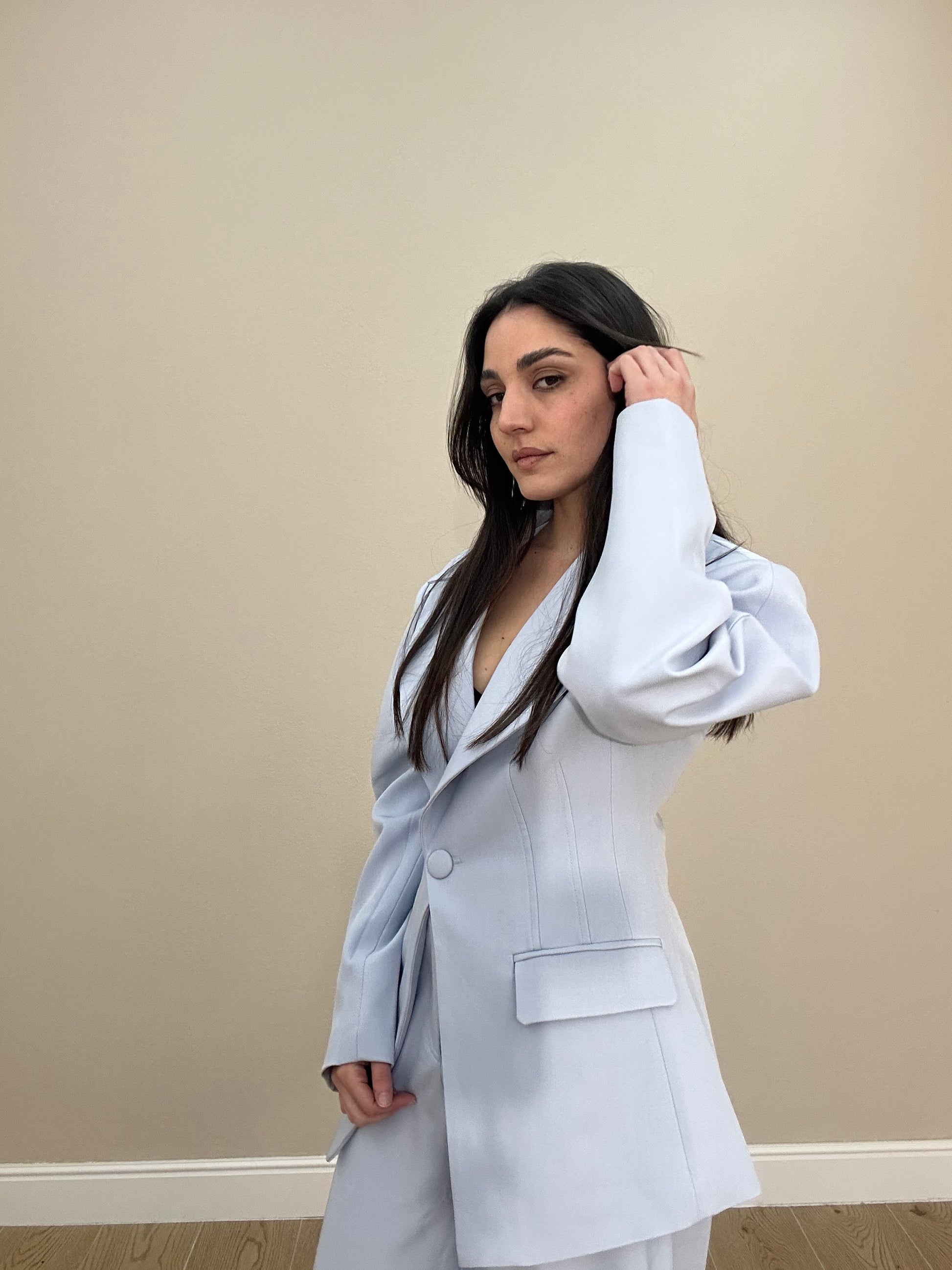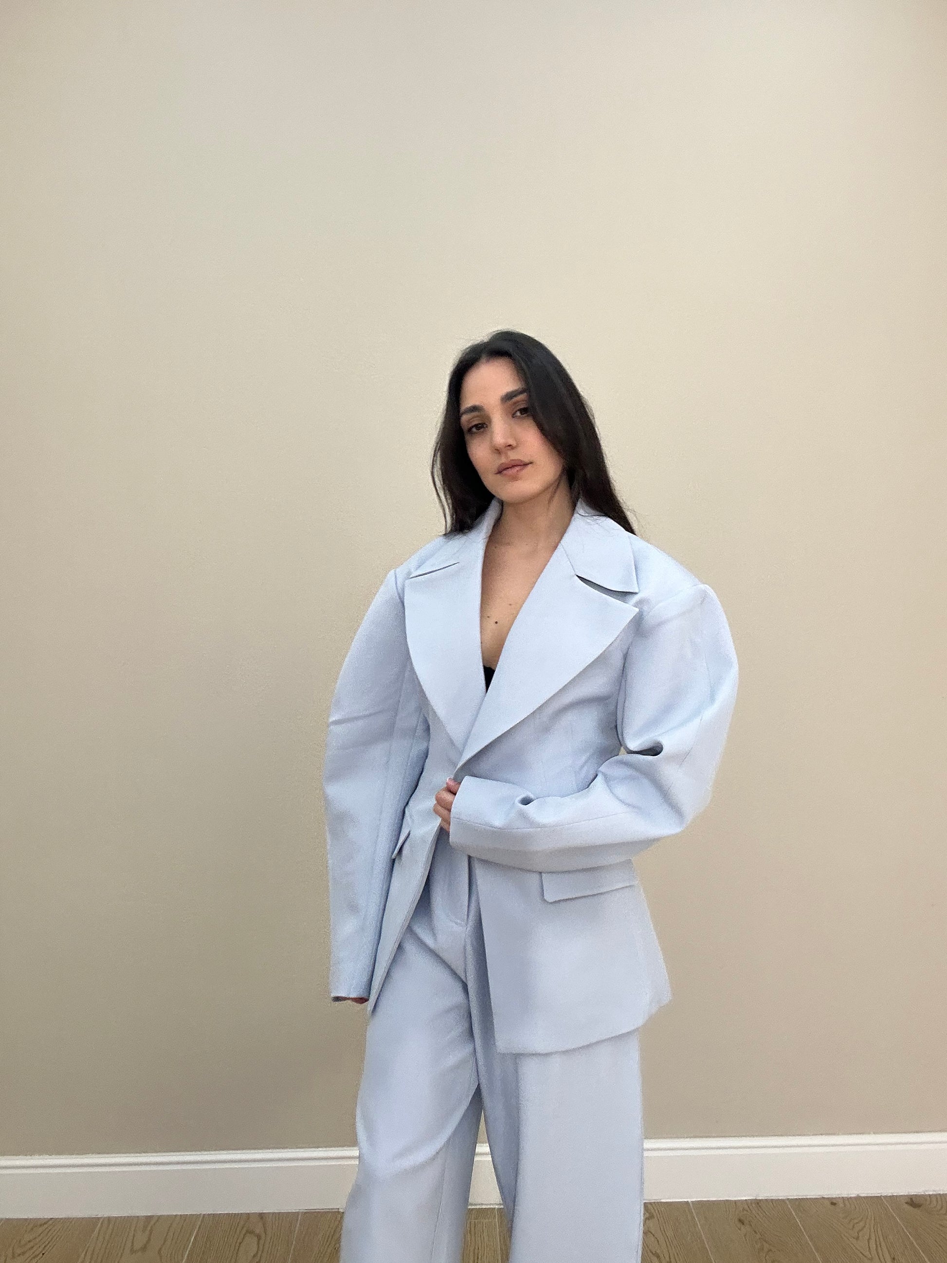 Giacca modello monopetto con ampi revers a lancia, tasche a filetto e maniche scultoree dal volume arrotondato.